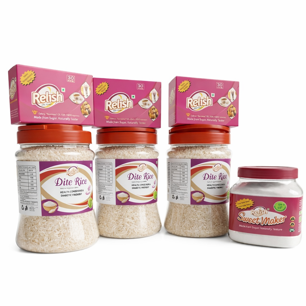 The Sugar-Smart Starter Kit is a diabetic-friendly combo pack designed to promote healthier eating. It includes 3 Kg of Diet Rice, 3 packs of Relish Diet Sugar Sachets (30 each), and 500 g of Relish Sweet Maker—a complete solution for managing sugar intake without compromising on taste.